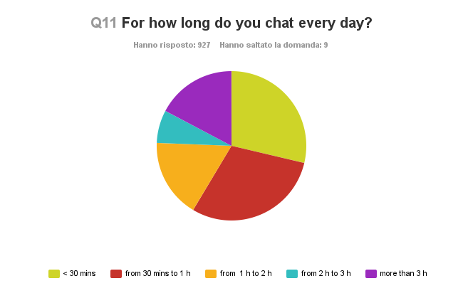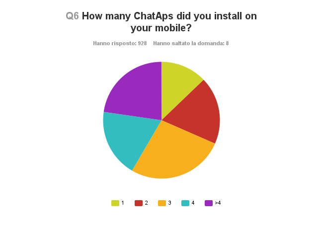 Dall’indagine risulta anche che 1 utente su 4 ha 3 App di IM installate sul telefono e il 40% più di 4 App. Solo il 13% ha solo un’App. Conclusione: anche se WhatsApp ha la supremazia, c’è la propensione degli utenti a provare altre App di IM. Il 40% degli utenti utilizza 2 o 3 App di IM e solo il 27% ne usa una.
