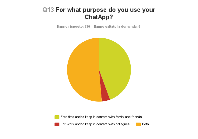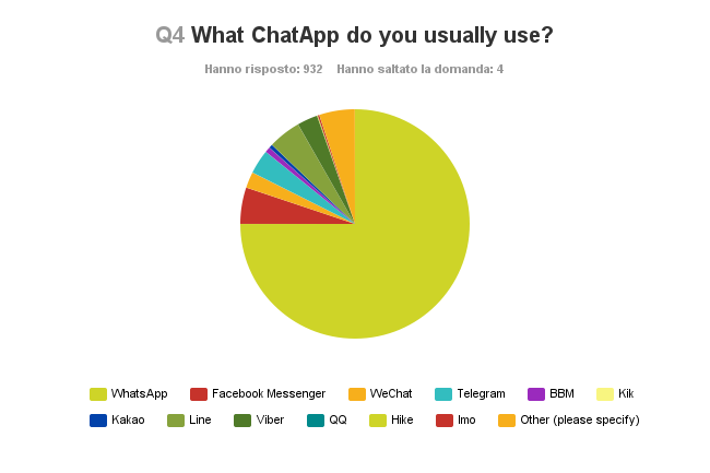 Alla domanda “Quale ChatApp utilizzi abitualmente?”, i dati confermano il primato di WhatsApp, che rappresenta il 75% delle App. La seconda App, Facebook Messenger, si ferma al 5%, seguita da Wechat con il 4% e da Telegram con il 3,4%. Di fatto inesistenti le altre App.
