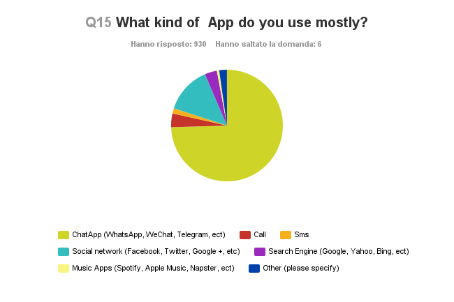 In chiusura, un dato interessante: il 75% degli utenti dichiara che le App di IM sono le più importanti. Le chiamate si fermano sotto il 4%. Gli SMS sono di fatto inesistenti. E’ dunque confermato - come emerso da studi recenti (ad es. il report Digital, Social & Mobile 2015 di We Are Social) - il declino delle chiamate e degli SMS, ma anche dei Social Network tradizionali.
