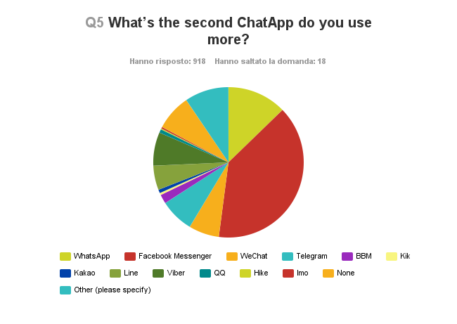 Per quanto riguarda la seconda App più utilizzata dagli utenti, il dato parla chiaro: stravince Messenger con il 40% delle preferenze. WhatsApp si attesta al 12%. Se si somma questo valore con il precedente, emerge che quasi il 90% degli utenti utilizza WhatsApp come prima o seconda applicazione. Telegram supera WeChat.
